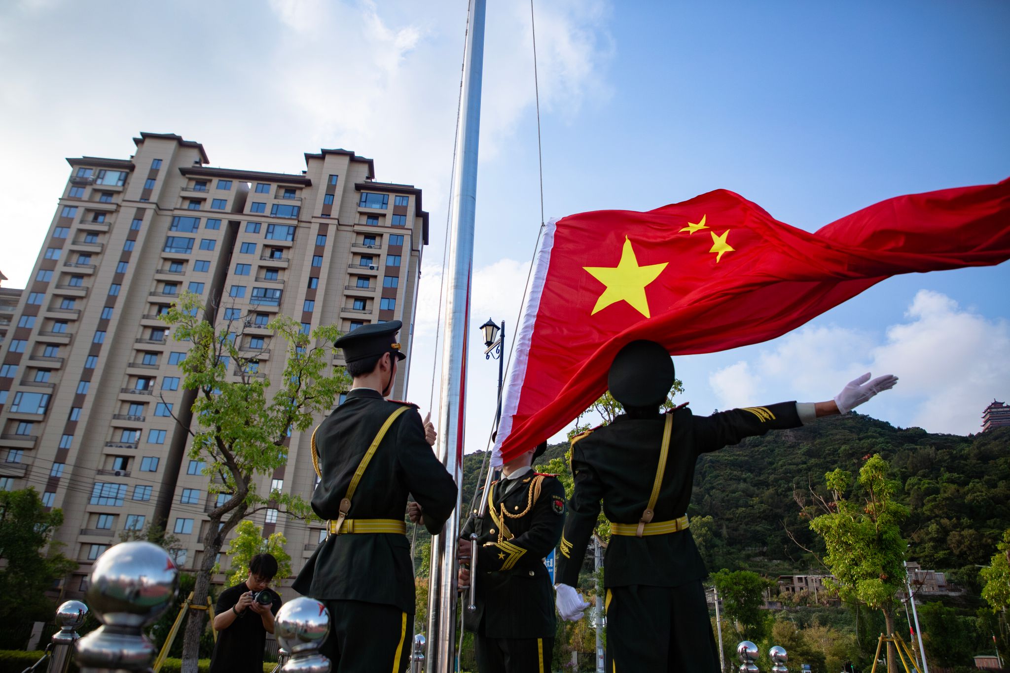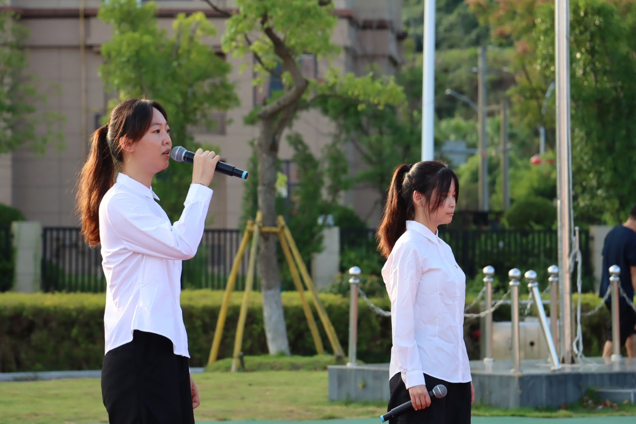 随后,升国旗仪式正式开始,国旗护卫队迈着铿锵有力的步伐护送国旗入场。全体师生肃立,高唱国歌,共同注视着五星红旗冉冉升起,在晨光中迎风飘扬。